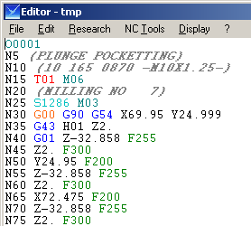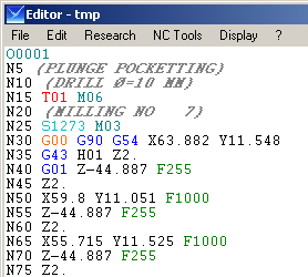 G01, iki paso arasındaki her hareket için programlanır. İlerleme hızı değerleri, çevrimin 'Teknoloji' sayfasından okunur. Kullanın geri dön (Z'de) ve geri çekilme (XY'de) ilerleme hızlarını, örneğimizde sırasıyla F300 ve F200. Ayrıca her G1 hareketi için genel ilerleme hızını da kullanın (burada F255). Bunun için geri dönme ve geri çekilme ilerleme hızlarını 0 olarak ayarlayın. |