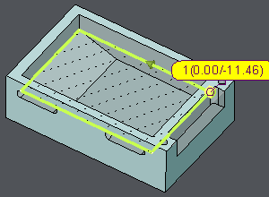 Düz olmayan alt yüze sahip cep İlk olarak, kenarı içeren düz yüzey seçilir (bu durumda üst yüzey). Ardından, gerekli cep kenarı belirtilir. Alt Z değeri daha sonra eğimin başladığı yükseklik seçilerek belirtilir. Bu yapılandırma, eğim yüzeyini dahil etmeden cepte bir kaba paso yapılmasını sağlar. |