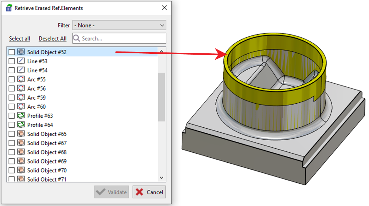 Bu komut, Düzenle → Veritabanı → Silinmiş Ref. Element'i Geri Getir menüsünden erişilebilir. |