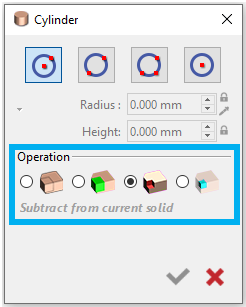 Katılar oluştururken, Boole İşlemi ikinci bir katı oluşturulduğunda kullanılabilir hale gelir, bu da size birleştirmeye gibi işlemlerle katıları birleştirme, çıkarma veya kesişme bağımsız bir katı oluşturma yeteneği ile birlikte. Ayrıca renk kodlaması farklı işlem için atanan (Birleştirme: yeşil / Çıkarma: kırmızı / Kesişim: mavi ). |
