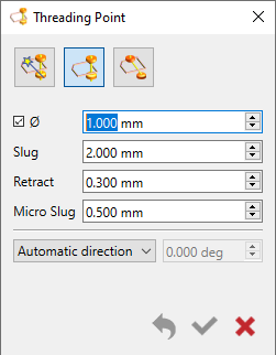 Bu fonksiyon, işleme öncesi hazırlık adımıdır. Diş açma noktası, slug ve micro slug değerleri ve paso aralarındaki geri çekilme gibi kullanışlı işleme bilgileri içerir. Oluşturma, profil analizine bağlıdır ve işlenecek çok sayıda profil varsa seçim kutusu ile çok hızlıdır. |