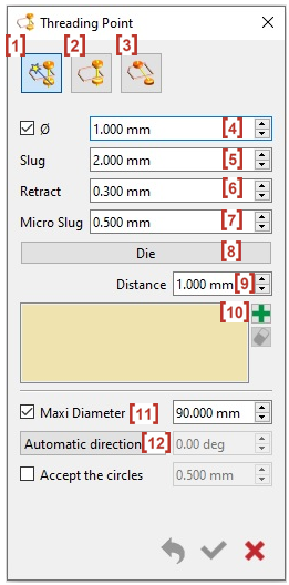Select the function: Auto threadings on profiles [1] Enter the çap [4] of the threading point and the ofset Mesafesi [9] (resimlerde 1) relative to the shape. arasından seçim yapın kalıp veya zımba diş açma noktasının şeklin içine veya dışına konumunu vermek için. [8] Diş açma noktası, profilin en uzun eleman boyunca otomatik olarak oluşturulur. Elbette, kutu ile seçim kullanarak birden çok profilin diş açma noktalarını otomatik olarak oluşturabilirsiniz. [10] As for the Maksimum çap [11] , it is used in case of machining of circle. Diş açma noktası dairenin merkezindedir, 'mesafe' değeri ile profile daha yakındır. You can define the angle direction [12] için Otomatik yön ”, “ Yalnızca daireler için zorla veya Tüm şekiller için zorla ”. |