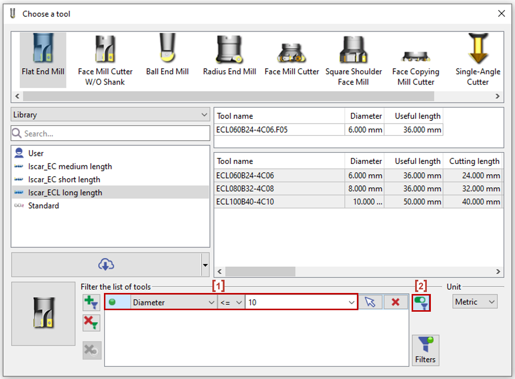 Bir geometri seçtiğinizde, bazı takım filtreleri takım çapı ile otomatik olarak uygulanır ( [1] on the image below) and sometimes Bottom radius.