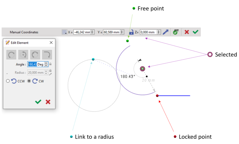 从 V6.11 开始,一个 正在编辑的元素 和 元素在 之后是不同的。这些颜色可以在“工具”>“选项”>“主题”中由用户定义。 有关更多信息,请查看页面 主题 . |