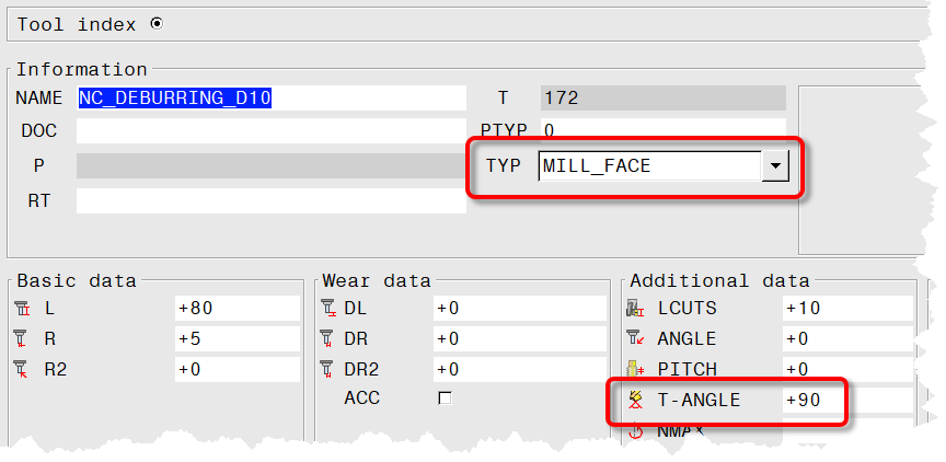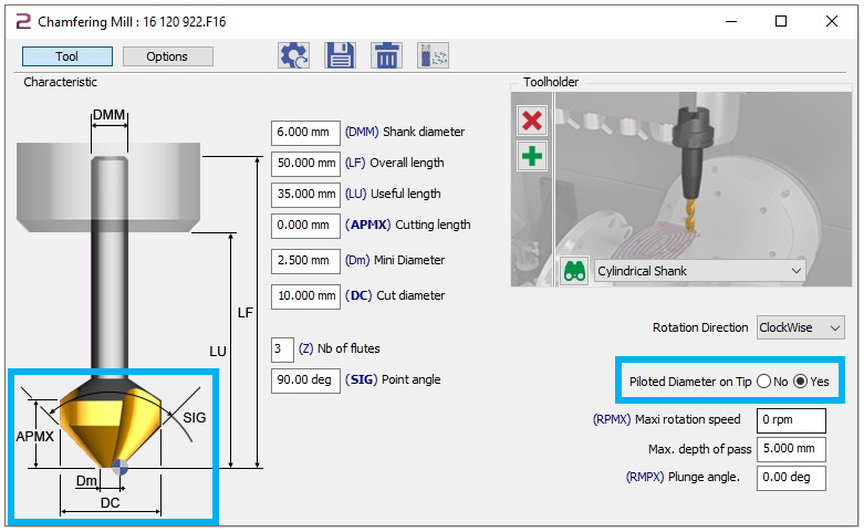 在刀具类型中,有一个截锥刀(类型155),但它只提供了指定直径和角度的可能性。作为参数的第二个直径或切削刃长度不提供。 |
