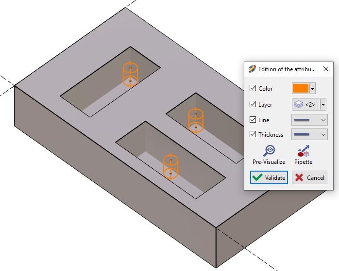 2/ 使用opelist自动创建 定义自动预钻孔的第一步是在单独的图层中创建孔的几何图形。在这种情况下,孔设置在图层2。 还将型腔的底面颜色更改为不同的颜色,例如我们在此处将其更改为黄色。
