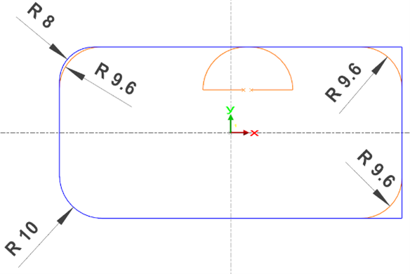 在这里,尖角显示为尖角,但圆角始终显示为 ,但半径更大,这是由刀具半径乘以参数 ,正常显示。 R max 因子 (角R8左上角): 在此示例中,因子被夸大为1.2以显示效果,因此半径为8mm x 1.2 = 9.6mm Pocket+Contour循环 因此,这些设置不适用于加工轮廓,其中内半径的尺寸精度很重要,并且刀具半径已等于角半径: 在尖角处,角半径是刀具的实际半径 |