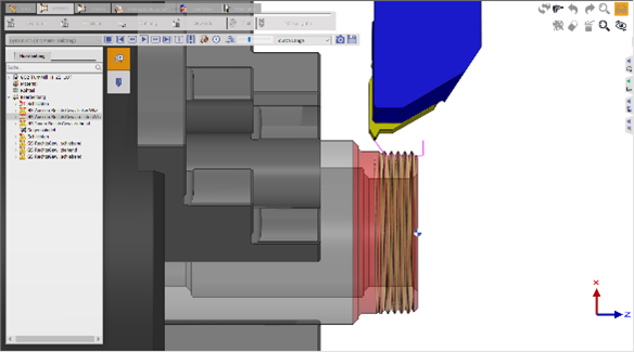 因此, 第一次 和 最后 必须根据所需的总深度和粗加工次数选择进给量(反之亦然)。 如果使用的后处理器将螺纹加工输出为机床循环(例如 SIEMENS 的 CYCLE97 或 Fanuc 的 G76),则关键参数是螺纹螺距、总深度和(粗加工)次数。在这种情况下,NC 代码始终是正确的。 参数组合不正确可能导致螺纹加工模拟不正确。如果使用的后处理器不输出机床循环,而是使用 G33 输出各个切削,那么在这种情况下 NC 代码也是不正确的! |