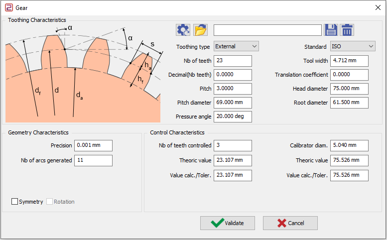 您可以选择对称以绘制完整的齿,如果还选择旋转,则在验证后将绘制整个齿轮。