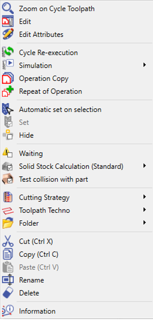 在 仿真 子菜单中,您可以从选择的特定循环开始刀具路径仿真。此功能允许更灵活、更精确地分析您的加工过程。在子菜单中,您可以访问以下选项: |