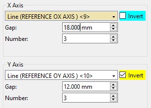 对于线性阵列模式 (复制几何图形), ,您可以通过单击任何轴或几何图形来选择“X”和“Y”轴。屏幕上应用了两种颜色(黄色和浅蓝色)以进行可视化。