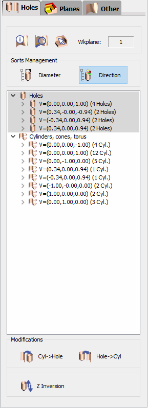 孔表格: 孔 是 应进行加工(钻孔等)的元素 其他元素(圆柱、圆锥、圆环)不应通过点到点操作进行加工。 排序管理: 提供每个元素的信息,您可以对其进行排序: 按 直径 、按 方向 ,或 组合 排序。 在我们的示例中 ,排序是按 方向 . 进行的。每个行都提供了孔的方向向量坐标,高亮显示的行显示了两个接近垂直但实际上并非如此的孔!此信息非常重要,如果没有分析很难获得。 |