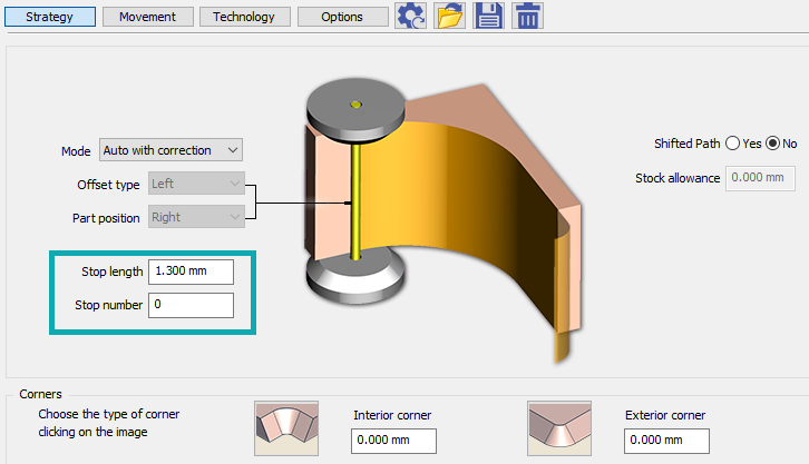 这些参数允许定义一个 停止点 在轮廓线上作为安全措施,以防止工件意外坠落。停止点通常定义在轮廓的最后一个实体上。