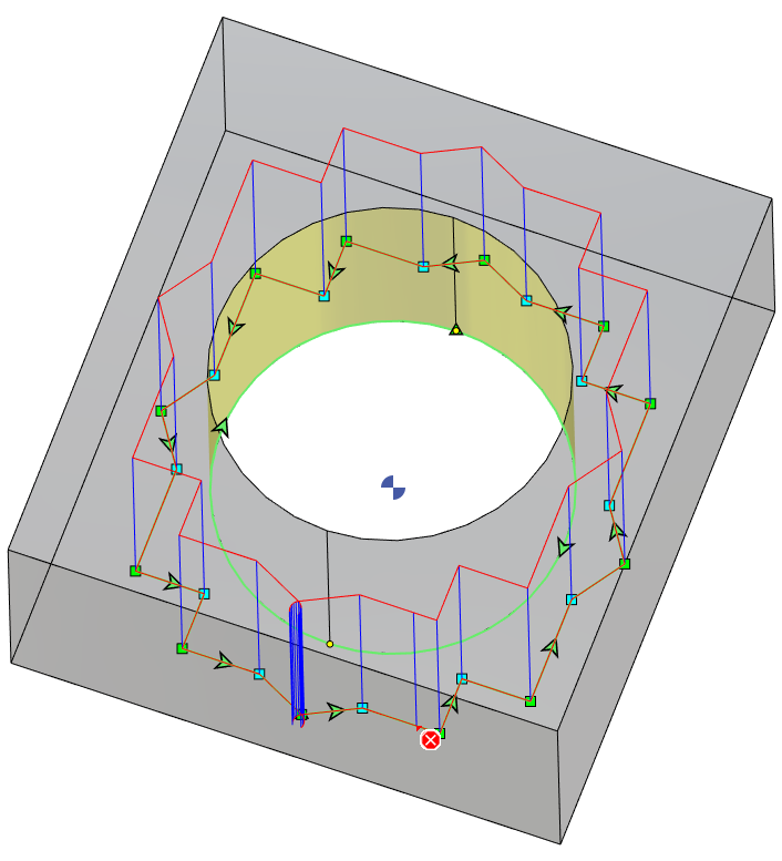 该 停止长度 定义了停止点相对于轮廓上最后一个实体的位置。如果停止长度大于最后一个实体的长度,则停止点设置在之前的实体或实体上。轮廓上会生成停止点的视觉指示,显示为一个红色的十字。
