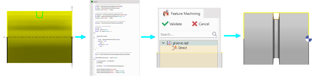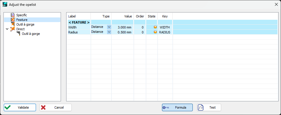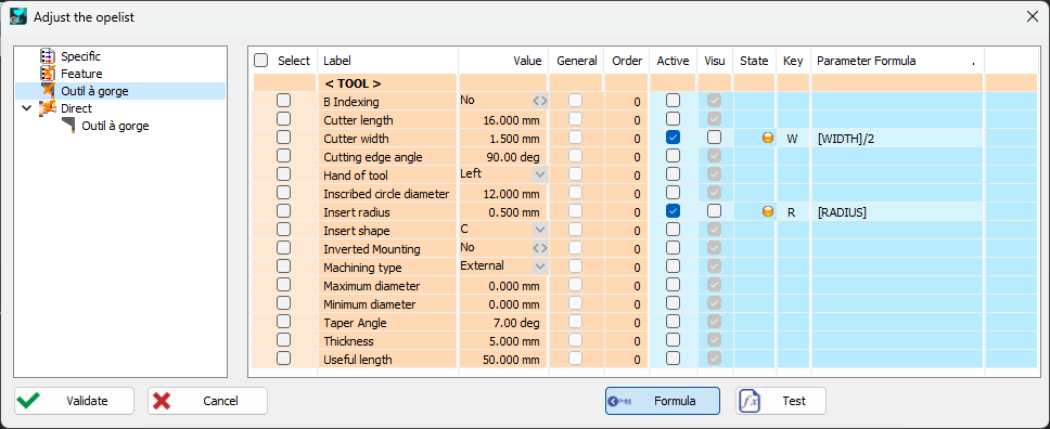 Let's consider you have a direct grooving opelist ('groove.opl') having 2 feature parameters (width and radius) used to set the tool cutter width and insert radius parameters